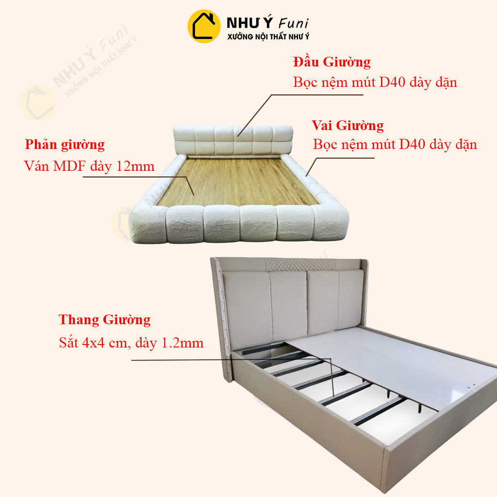 Mỗi chiếc giường bọc nệm tại Như Ý Funi đều được sản xuất bằng tâm huyết và tay nghề cao của đội ngũ thợ lành nghề. Phần khung giường sử dụng thang vạt sắt hộp 4x4cm, dày 1.2mm với 5 thanh chịu lực, giúp giường chịu tải lên đến 400kg – phù hợp cho mọi đối tượng sử dụng.